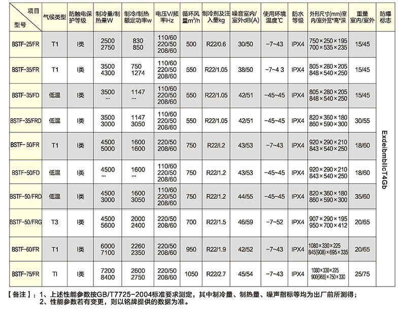 電力專用防爆空調(diào)主要型號及技術(shù)參數(shù):